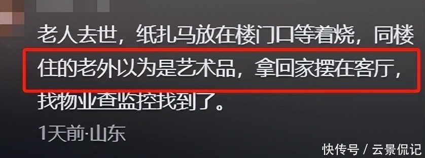 有长期居住在中国的老外,看到楼下摆放的纸扎马,误以为是现代艺术装置,搬回家摆在客厅中央展示,直到物业调取监控上门说明,才恍然大悟那是祭奠亡者的用品。