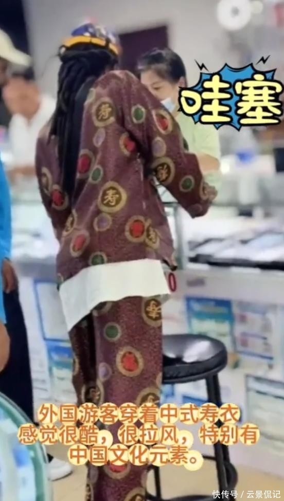 这几名外籍人士显然不太通晓中文,更不了解“寿衣”在中国语境中的特殊含义。他们或许只是被服装鲜艳的色彩与精致的刺绣吸引,误以为这是中国传统民族服饰的一种。